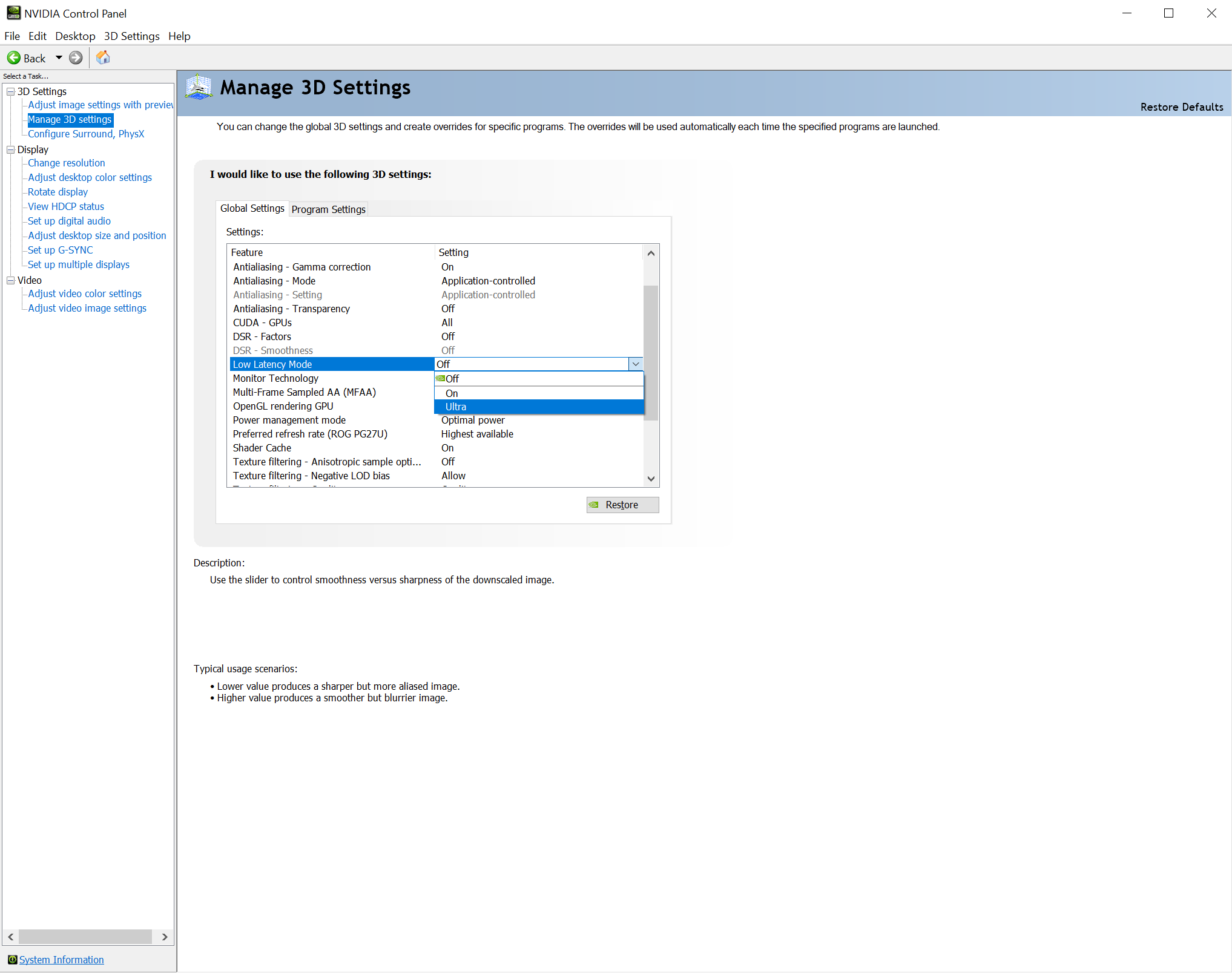 如果游戲受制于顯卡瓶頸,幀率在60-100FPS之間,低延遲模式最有用,可以在不損失畫質(zhì)的前提下加快游戲響應(yīng),而且可以針對每個游戲設(shè)置不同的延遲模式。