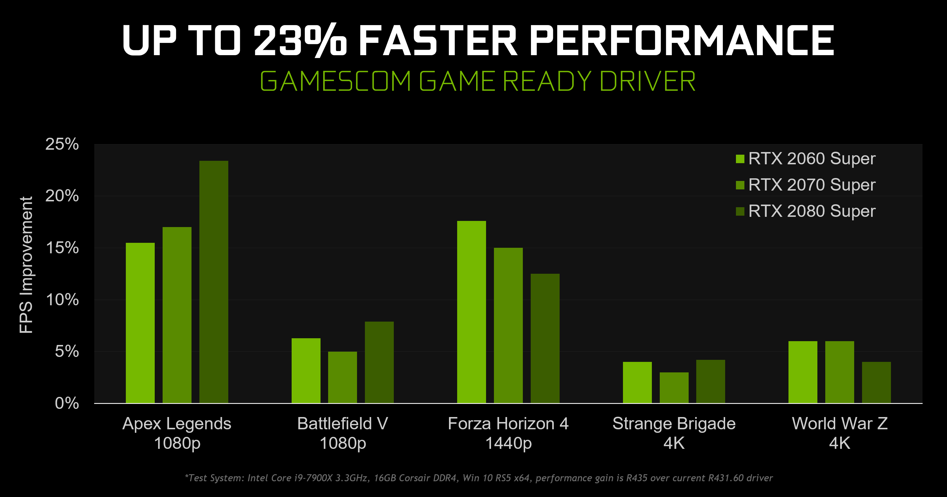 GeForce 436.02新驅(qū)動下,《Apex英雄》、《戰(zhàn)地5》、《極限競速:地平線4》、《奇異小隊(duì)》、《僵尸世界大戰(zhàn)》等游戲的性能,相比于此前的431.60版本,可提升最多達(dá)23.4%。