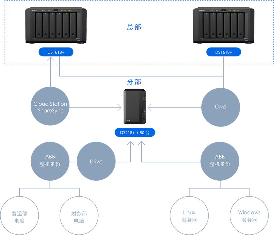 針對門店營運部、財務(wù)部電腦里的重要文件,我們?yōu)殡娔X設(shè)置賬戶并進(jìn)行備份。先用 Drive 將辦公文件備份到分部的 NAS 上,然后再通過 Cloud Station ShareSync ?將文件統(tǒng)一同步并歸檔到總部的 DS1618+ 上。想要管理眾多分部的 80 臺 DS218+ 也很方便,我們可以在總部的 DS1618+ 上統(tǒng)一配置、監(jiān)控所有分部的數(shù)據(jù),并選擇性同步下發(fā)各項公文、通知。